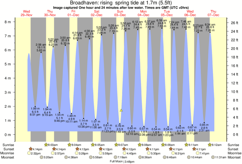 Image captured One hour and 24 minutes after low water (rising spring tide). Tide height was 1.7m (5.5 ft). Range 7.34m (24.1 ft). Toggle tide graph