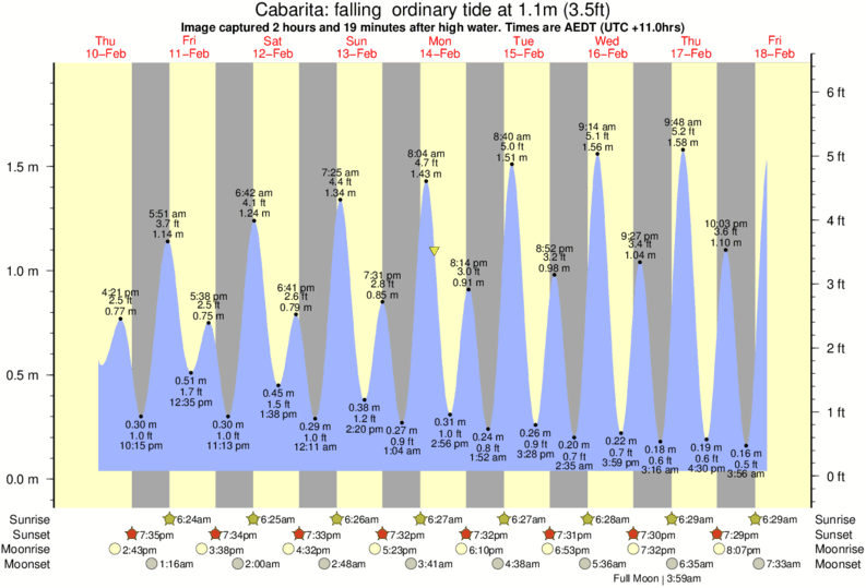 Image captured 2 hours and 19 minutes after high water (falling ordinary tide). Tide height was 1.1m (3.5 ft). Range 1.78m (5.8 ft). Toggle tide graph