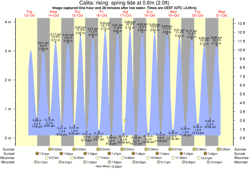 Image captured One hour and 28 minutes after low water (rising spring tide). Tide height was 0.6m (2.0 ft). Range 3.68m (12.1 ft). Toggle tide graph