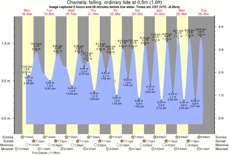 Image captured 2 hours and 28 minutes before low water (falling ordinary tide). Tide height was 0.5m (1.6 ft). Range 1.31m (4.3 ft). Toggle tide graph