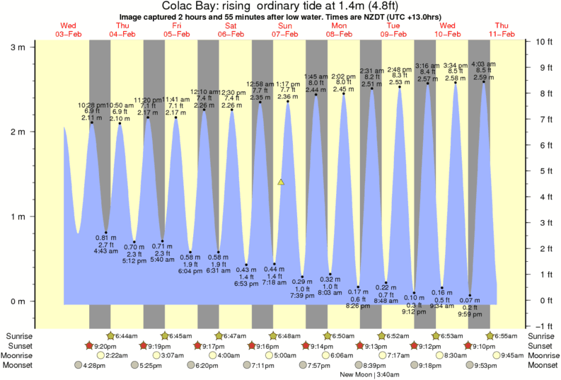 Image captured 2 hours and 55 minutes after low water (rising ordinary tide). Tide height was 1.4m (4.8 ft). Range 2.84m (9.3 ft). Toggle tide graph