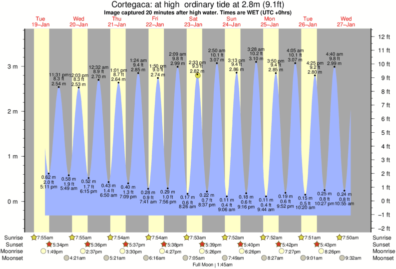 Image captured 20 minutes after high water (at high ordinary tide). Tide height was 2.8m (9.1 ft). Range 3.77m (12.4 ft). Toggle tide graph