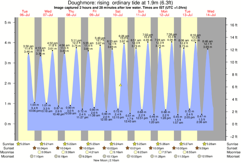 Image captured 2 hours and 28 minutes after low water (rising ordinary tide). Tide height was 1.9m (6.3 ft). Range 5.07m (16.6 ft). Toggle tide graph