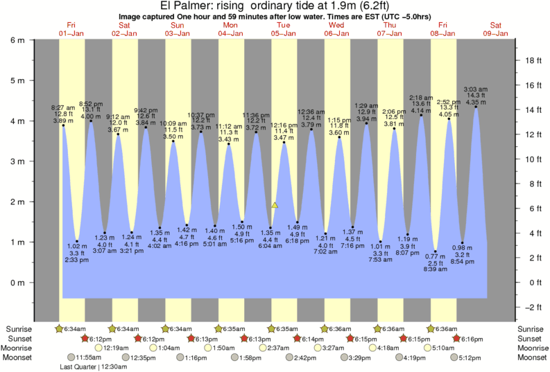 Image captured One hour and 59 minutes after low water (rising ordinary tide). Tide height was 1.9m (6.2 ft). Range 5.83m (19.1 ft). Toggle tide graph