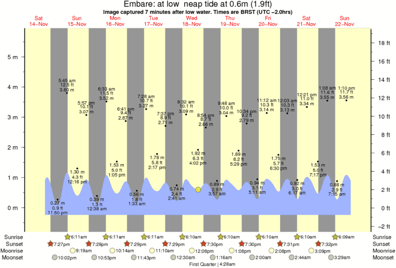Image captured 7 minutes after low water (at low neap tide). Tide height was 0.6m (1.9 ft). Range 5.63m (18.5 ft). Toggle tide graph