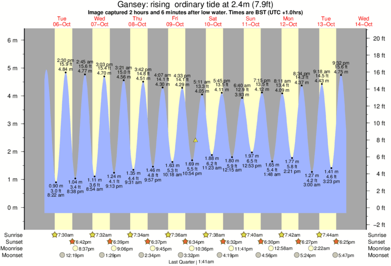 Image captured 2 hours and 6 minutes after low water (rising ordinary tide). Tide height was 2.4m (7.9 ft). Range 6.02m (19.8 ft). Toggle tide graph
