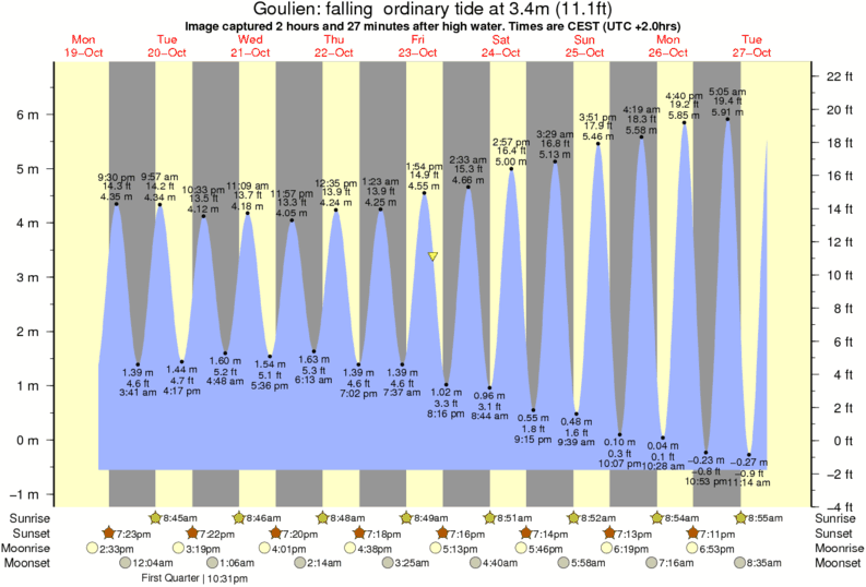 Image captured 2 hours and 27 minutes after high water (falling ordinary tide). Tide height was 3.4m (11.1 ft). Range 6.84m (22.4 ft). Toggle tide graph