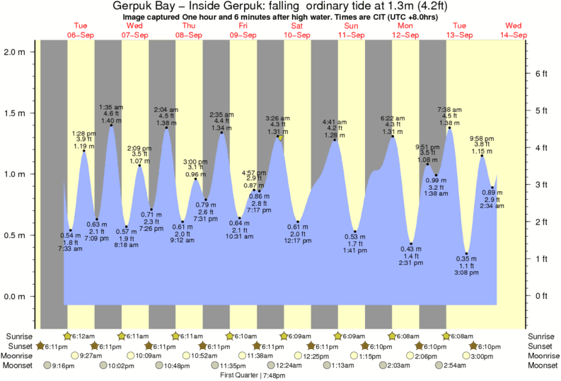 Image captured One hour and 6 minutes after high water (falling ordinary tide). Tide height was 1.3m (4.2 ft). Range 1.97m (6.5 ft). Toggle tide graph