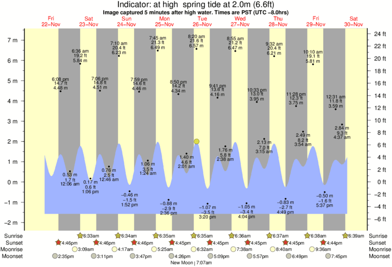 Image captured 5 minutes after high water (at high spring tide). Tide height was 2.0m (6.6 ft). Range 8.32m (27.3 ft). Toggle tide graph