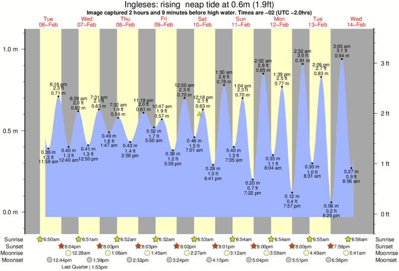 Image captured 2 hours and 9 minutes before high water (rising neap tide). Tide height was 0.6m (1.9 ft). Range 1.05m (3.4 ft). Toggle tide graph
