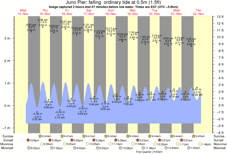 Image captured 2 hours and 47 minutes before low water (falling ordinary tide). Tide height was 0.5m (1.5 ft). Range 4.35m (14.3 ft). Toggle tide graph