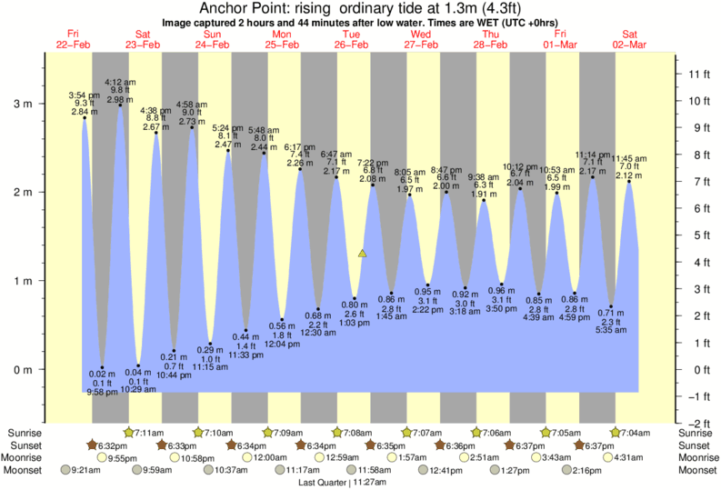 Image captured 2 hours and 44 minutes after low water (rising ordinary tide). Tide height was 1.3m (4.3 ft). Range 3.49m (11.5 ft). Toggle tide graph