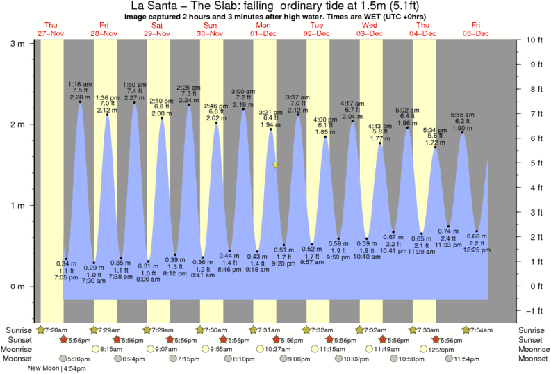 Image captured 2 hours and 3 minutes after high water (falling ordinary tide). Tide height was 1.5m (5.1 ft). Range 2.92m (9.6 ft). Toggle tide graph