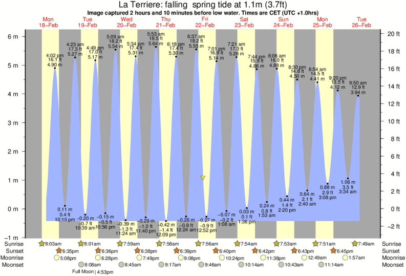 Image captured 2 hours and 10 minutes before low water (falling spring tide). Tide height was 1.1m (3.7 ft). Range 6.06m (19.9 ft). Toggle tide graph
