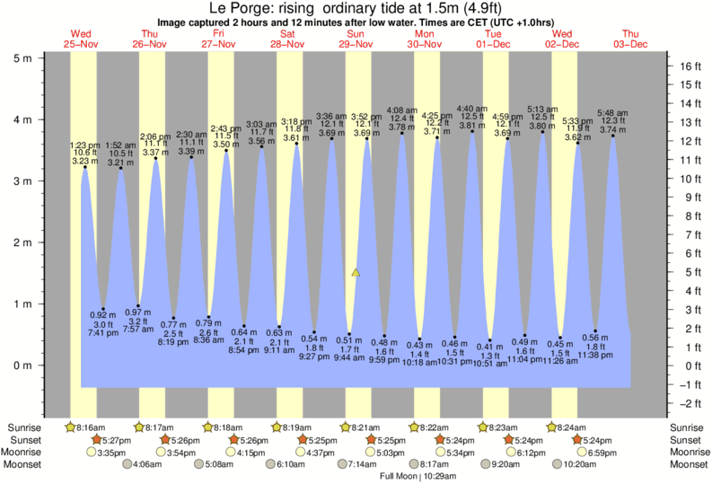 Image captured 2 hours and 12 minutes after low water (rising ordinary tide). Tide height was 1.5m (4.9 ft). Range 4.97m (16.3 ft). Toggle tide graph