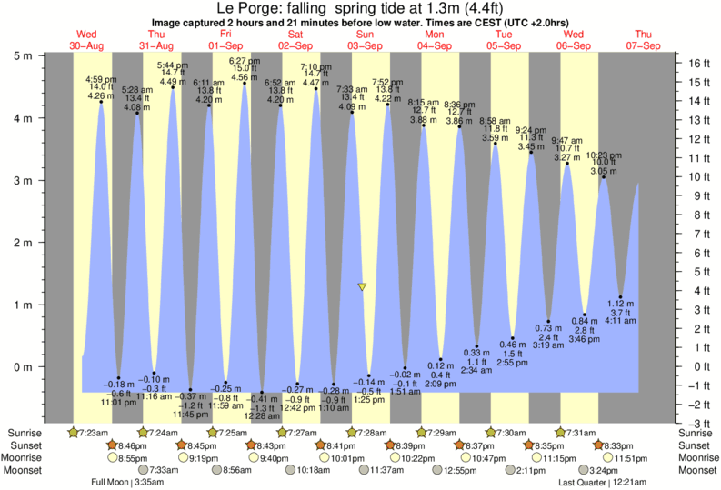 Image captured 2 hours and 21 minutes before low water (falling spring tide). Tide height was 1.3m (4.4 ft). Range 4.97m (16.3 ft). Toggle tide graph