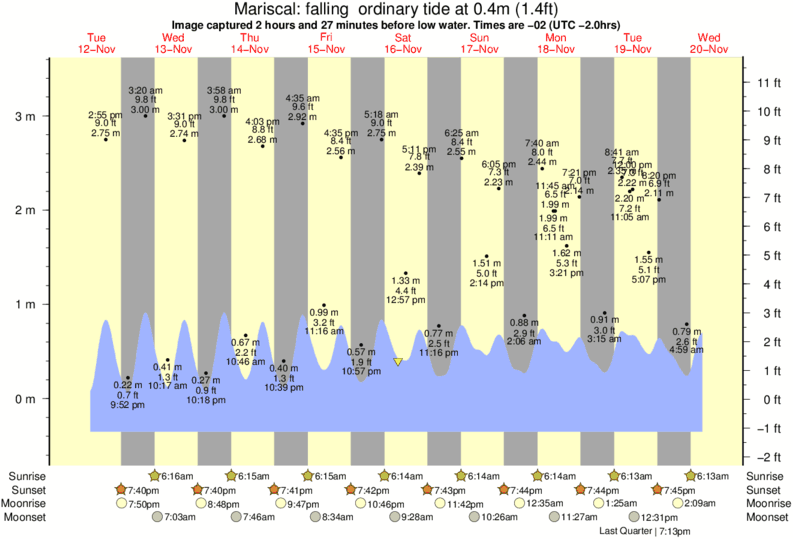 Image captured 2 hours and 27 minutes before low water (falling ordinary tide). Tide height was 0.4m (1.4 ft). Range 3.61m (11.8 ft). Toggle tide graph