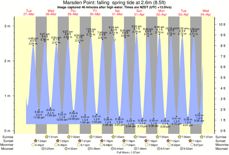 Image captured 46 minutes after high water (falling spring tide). Tide height was 2.6m (8.5 ft). Range 2.80m (9.2 ft). Toggle tide graph