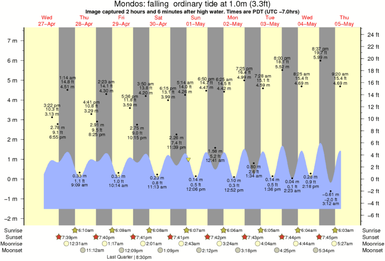 Image captured 2 hours and 6 minutes after high water (falling ordinary tide). Tide height was 1.0m (3.3 ft). Range 8.35m (27.4 ft). Toggle tide graph