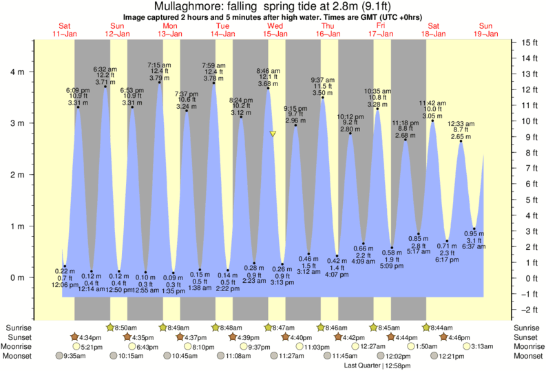 Image captured 2 hours and 5 minutes after high water (falling spring tide). Tide height was 2.8m (9.1 ft). Range 4.55m (14.9 ft). Toggle tide graph