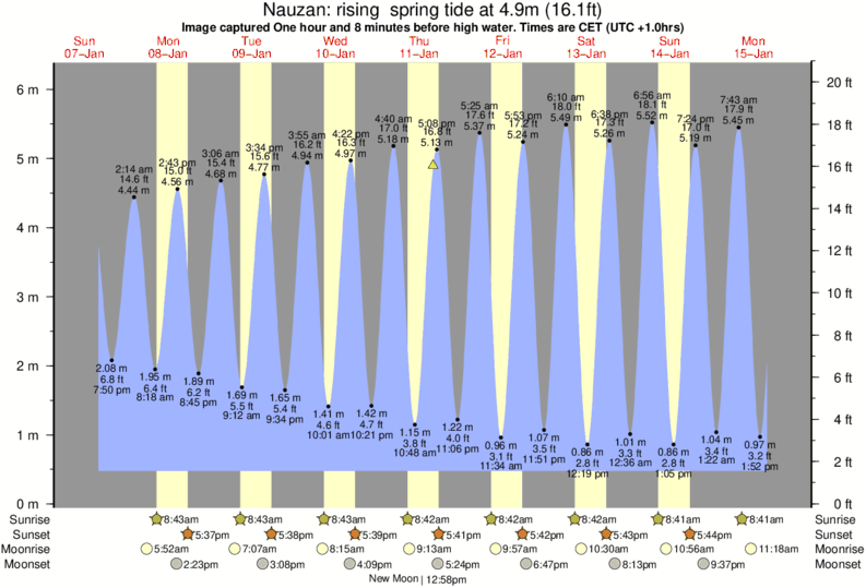 Image captured One hour and 8 minutes before high water (rising spring tide). Tide height was 4.9m (16.1 ft). Range 5.37m (17.6 ft). Toggle tide graph