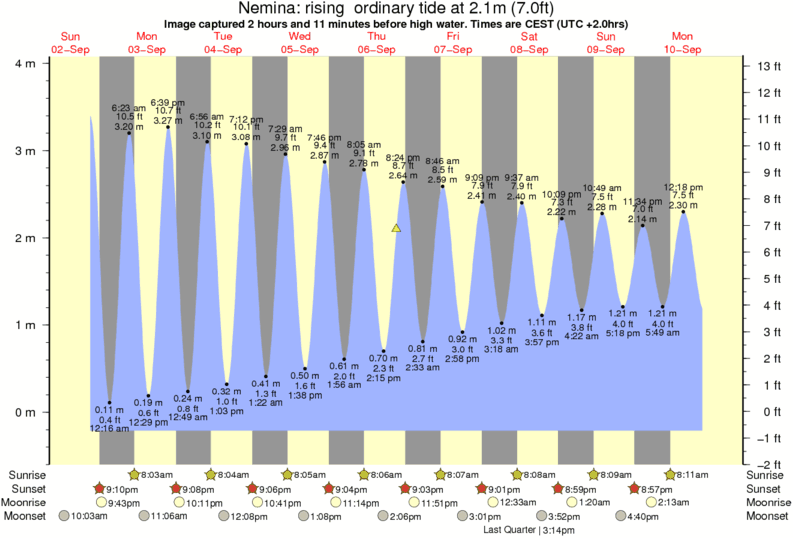 Image captured 2 hours and 11 minutes before high water (rising ordinary tide). Tide height was 2.1m (7.0 ft). Range 3.90m (12.8 ft). Toggle tide graph