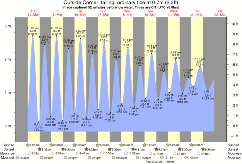 Image captured 52 minutes before low water (falling ordinary tide). Tide height was 0.7m (2.3 ft). Range 3.12m (10.2 ft). Toggle tide graph