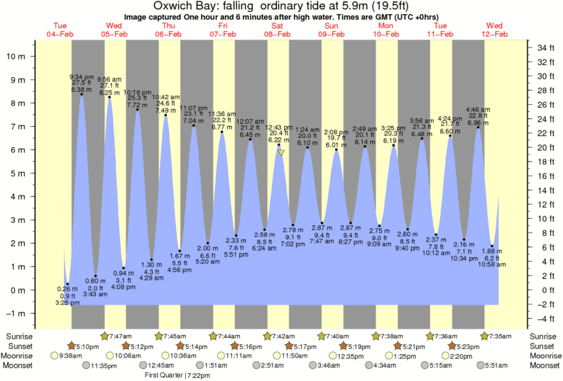 Image captured One hour and 6 minutes after high water (falling ordinary tide). Tide height was 5.9m (19.5 ft). Range 10.31m (33.8 ft). Toggle tide graph