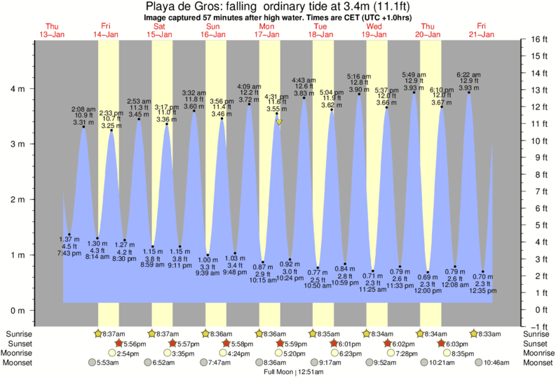 Image captured 57 minutes after high water (falling ordinary tide). Tide height was 3.4m (11.1 ft). Range 4.30m (14.1 ft). Toggle tide graph