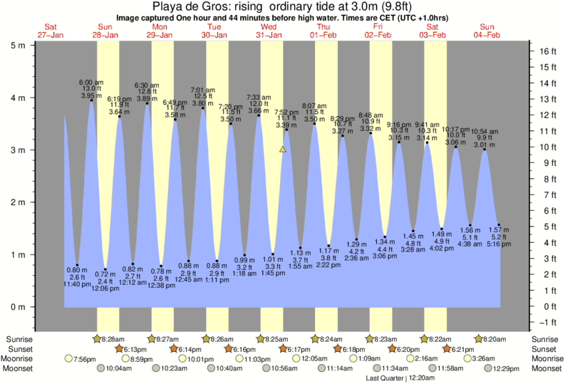 Image captured One hour and 44 minutes before high water (rising ordinary tide). Tide height was 3.0m (9.8 ft). Range 4.63m (15.2 ft). Toggle tide graph