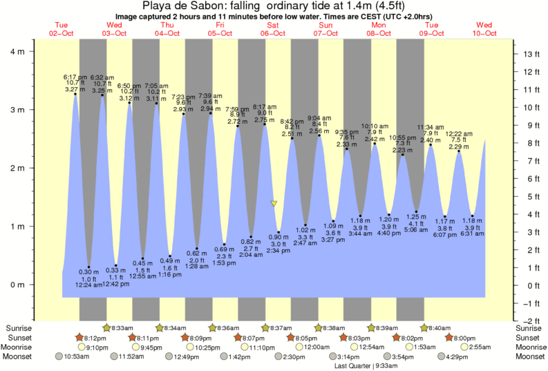 Image captured 2 hours and 11 minutes before low water (falling ordinary tide). Tide height was 1.4m (4.5 ft). Range 4.03m (13.2 ft). Toggle tide graph