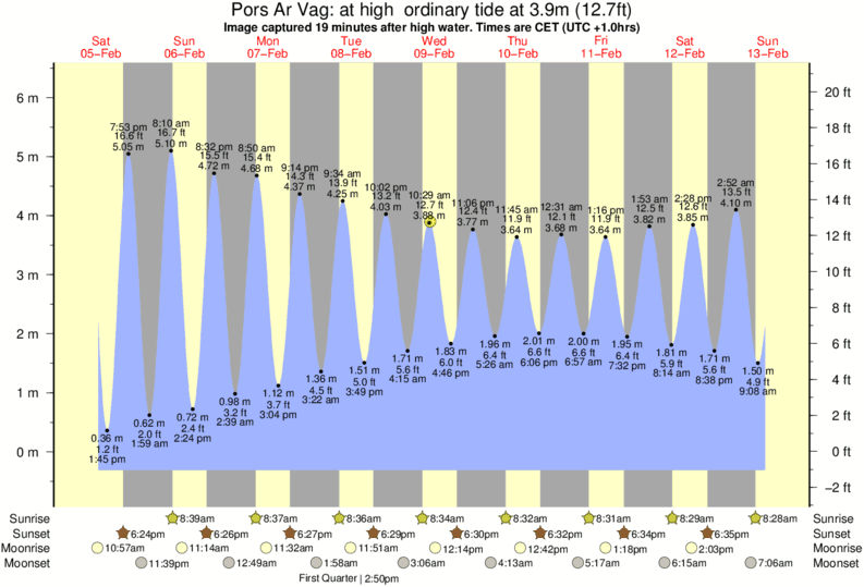 Image captured 19 minutes after high water (at high ordinary tide). Tide height was 3.9m (12.7 ft). Range 6.28m (20.6 ft). Toggle tide graph