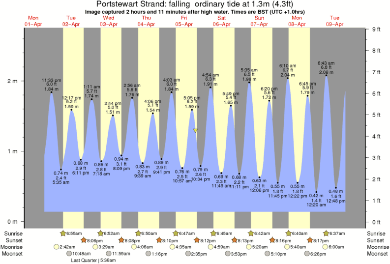 Image captured 2 hours and 11 minutes after high water (falling ordinary tide). Tide height was 1.3m (4.3 ft). Range 2.38m (7.8 ft). Toggle tide graph