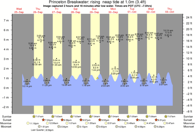 Image captured 2 hours and 16 minutes after low water (rising neap tide). Tide height was 1.0m (3.4 ft). Range 8.66m (28.4 ft). Toggle tide graph