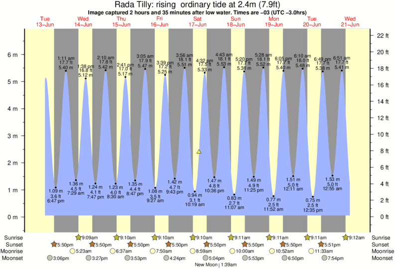 Image captured 2 hours and 35 minutes after low water (rising ordinary tide). Tide height was 2.4m (7.9 ft). Range 6.27m (20.6 ft). Toggle tide graph