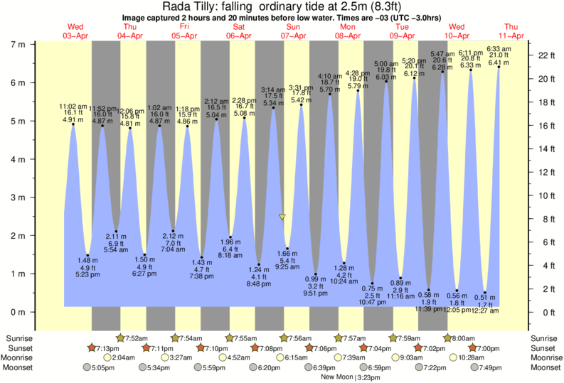 Image captured 2 hours and 20 minutes before low water (falling ordinary tide). Tide height was 2.5m (8.3 ft). Range 6.32m (20.7 ft). Toggle tide graph