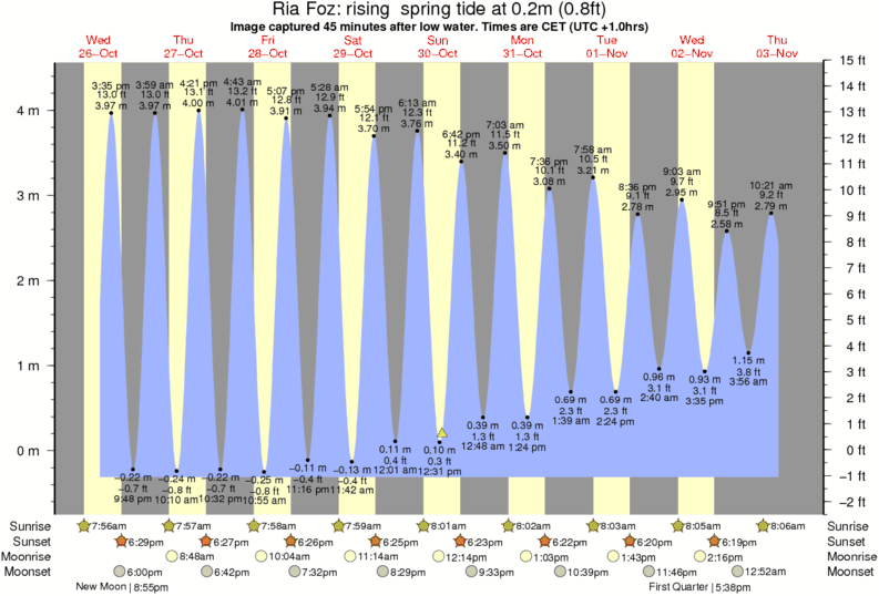Image captured 45 minutes after low water (rising spring tide). Tide height was 0.2m (0.8 ft). Range 4.43m (14.5 ft). Toggle tide graph