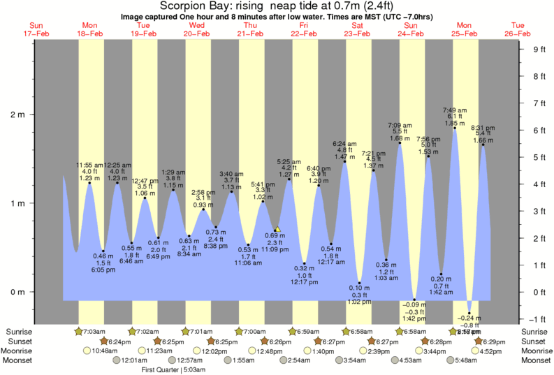 Image captured One hour and 8 minutes after low water (rising neap tide). Tide height was 0.7m (2.4 ft). Range 2.68m (8.8 ft). Toggle tide graph