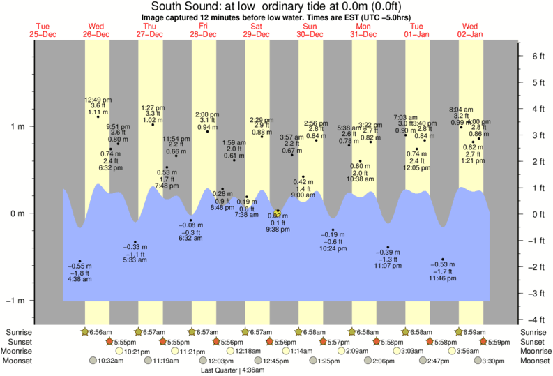Image captured 12 minutes before low water (at low ordinary tide). Tide height was 0.0m (0.0 ft). Range 2.73m (9.0 ft). Toggle tide graph