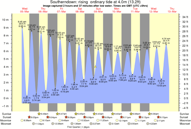 Image captured 2 hours and 37 minutes after low water (rising ordinary tide). Tide height was 4.0m (13.2 ft). Range 10.40m (34.1 ft). Toggle tide graph