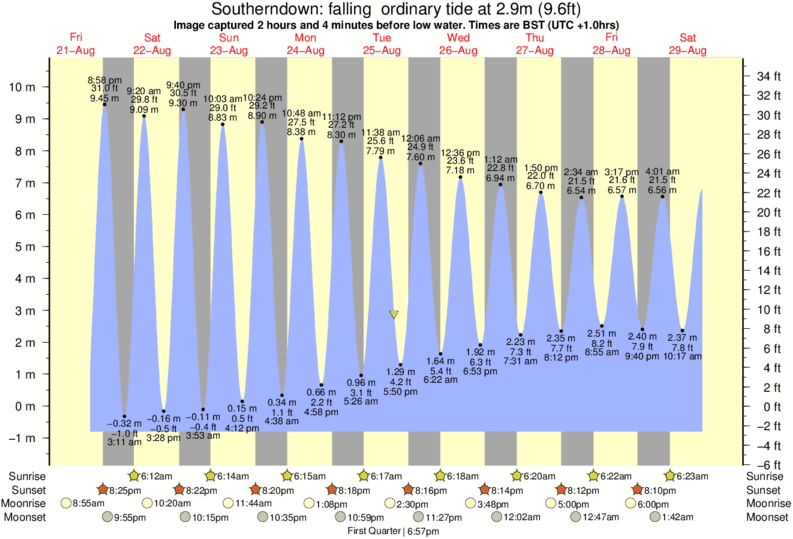 Image captured 2 hours and 4 minutes before low water (falling ordinary tide). Tide height was 2.9m (9.6 ft). Range 10.66m (35.0 ft). Toggle tide graph