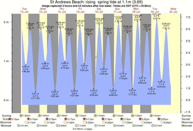 Image captured 3 hours and 24 minutes after low water (rising spring tide). Tide height was 1.1m (3.6 ft). Range 2.12m (7.0 ft). Toggle tide graph