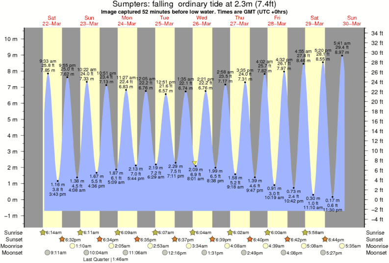 Image captured 52 minutes before low water (falling ordinary tide). Tide height was 2.3m (7.4 ft). Range 10.37m (34.0 ft). Toggle tide graph