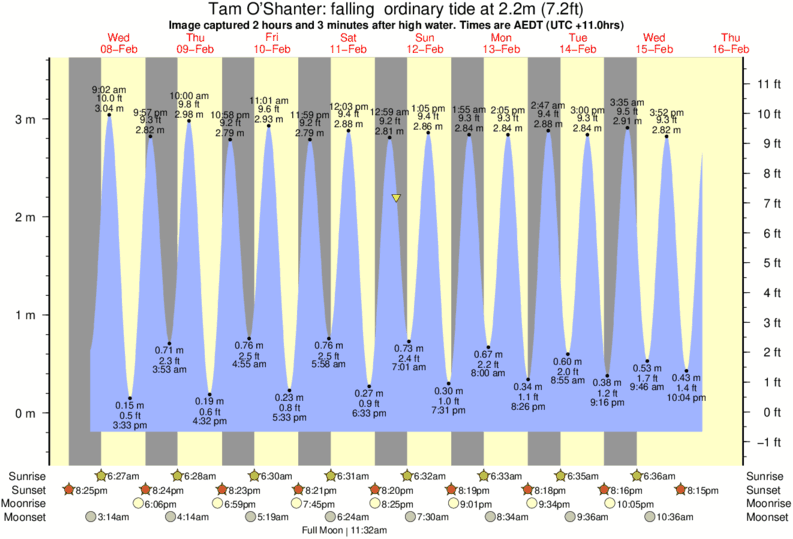 Image captured 2 hours and 3 minutes after high water (falling ordinary tide). Tide height was 2.2m (7.2 ft). Range 3.47m (11.4 ft). Toggle tide graph