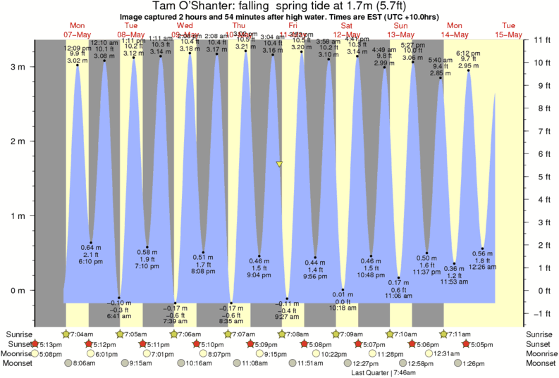 Image captured 2 hours and 54 minutes after high water (falling spring tide). Tide height was 1.7m (5.7 ft). Range 3.21m (10.5 ft). Toggle tide graph