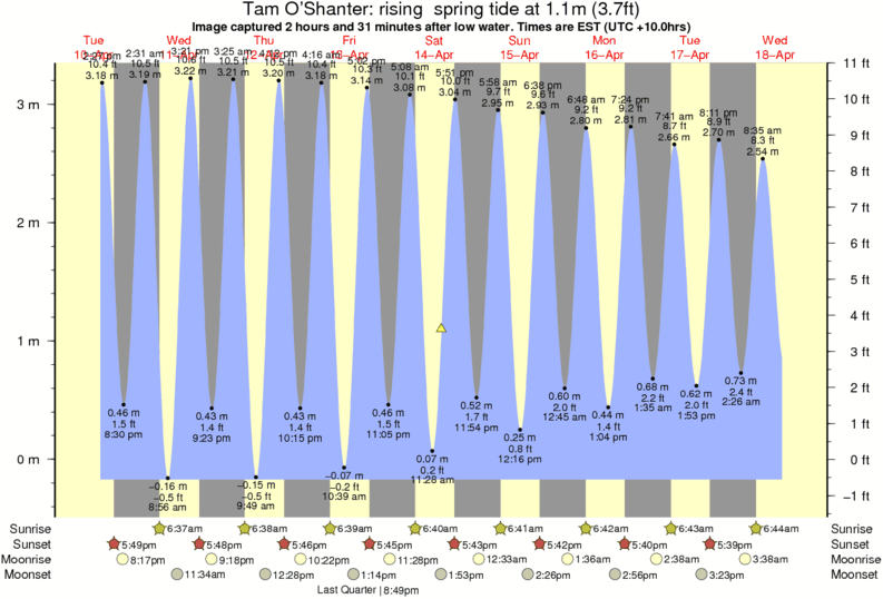 Image captured 2 hours and 31 minutes after low water (rising spring tide). Tide height was 1.1m (3.7 ft). Range 3.20m (10.5 ft). Toggle tide graph