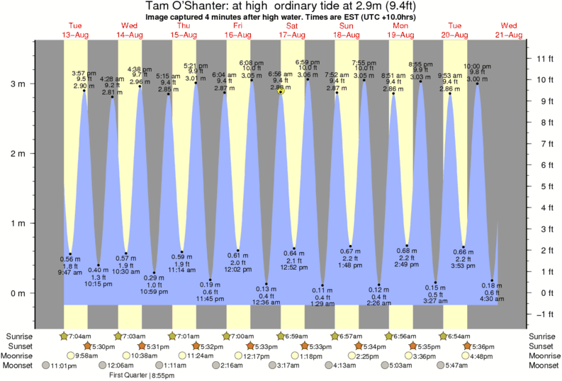 Image captured 4 minutes after high water (at high ordinary tide). Tide height was 2.9m (9.4 ft). Range 3.45m (11.3 ft). Toggle tide graph