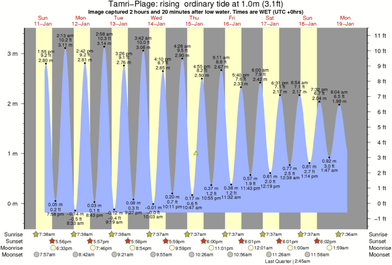 Image captured 2 hours and 20 minutes after low water (rising ordinary tide). Tide height was 1.0m (3.1 ft). Range 3.36m (11.0 ft). Toggle tide graph