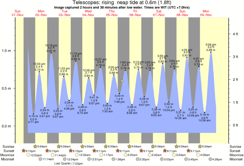 Image captured 2 hours and 38 minutes after low water (rising neap tide). Tide height was 0.6m (1.8 ft). Range 1.39m (4.6 ft). Toggle tide graph