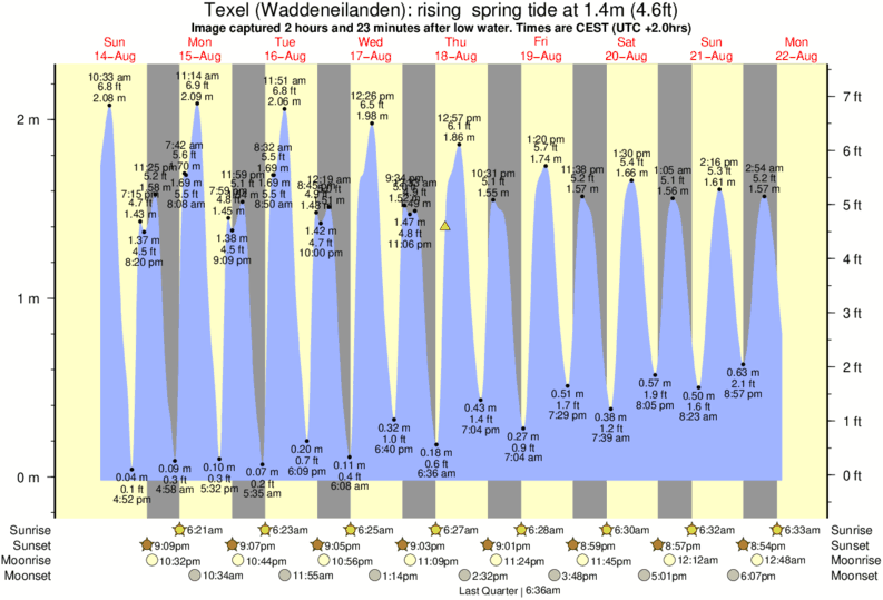 Image captured 2 hours and 23 minutes after low water (rising spring tide). Tide height was 1.4m (4.6 ft). Range 2.12m (7.0 ft). Toggle tide graph
